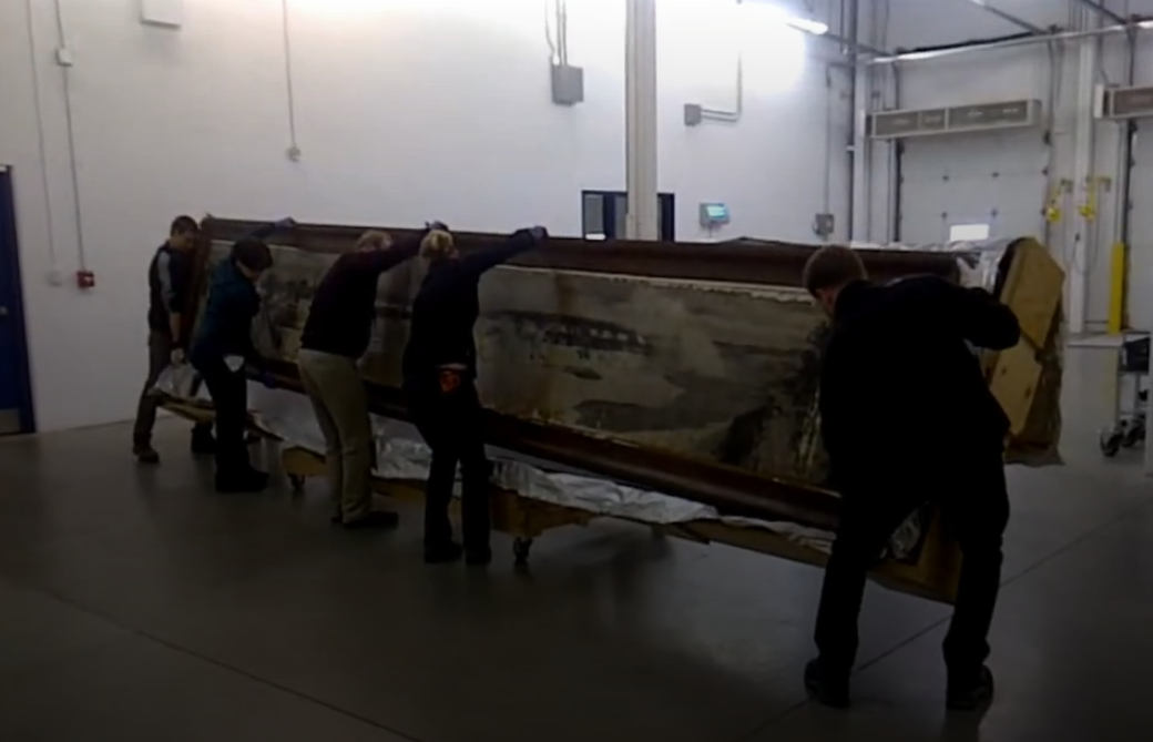 Après avoir soulevé les caisses des panoramas au-dessus de la rampe, l’équipe du déplacement les a posées à la verticale en soulevant la chaîne de levage. Les caisses à la verticale ont été abaissées par les commandes d’un tableau électrique et les membres de l’équipe ont fait « des bonds » à tour de rôle dans les escaliers pour stabiliser la charge jusqu’à ce qu’elle atteigne le rez-de-chaussée. Après les avoir sortis par l’entrée du bâtiment, l’équipe a chargé les panoramas et leurs cadres sur le camion de déménagement.